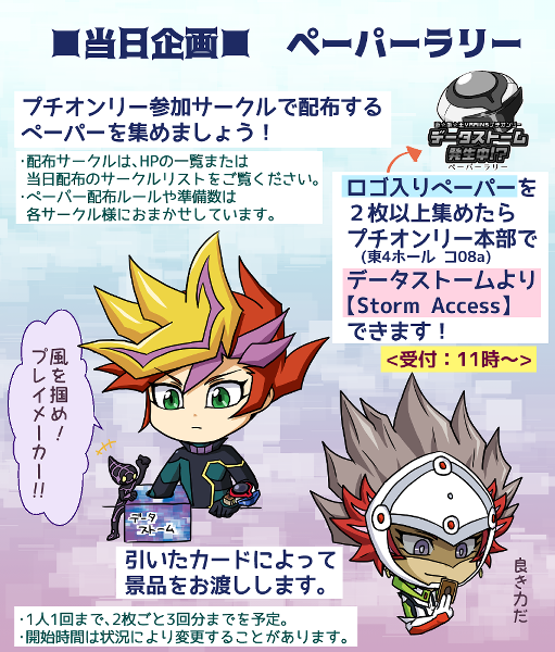 <当日企画>◆ペーパーラリー◆プチオンリー参加サークルで配布するペーパーを集めましょう! ラリー参加サークルは、参加サークルリストをご覧ください。 ▼ルール説明▼ プチロゴ入りペーパーを2枚以上集めたら、プチオンリー本部にて景品と交換することができます。 交換・くじ開始は11時頃からを予定しています。 ※当日配布サークル状況により、必要枚数が変更になる場合があります。 ▼その他・注意等▼ ・ペーパー配布ルール・枚数は各サークル様にお任せします。 ・景品交換は先着順となります。 数に限りがありますのであらかじめご了承ください。 ・お一人様1回までの受付でお願いします。(代理交換等もお控えください) ・当日の状況次第で時間や交換内容に変更がある場合は 本部にて告知を出しますので、確認してください。 ・景品用グッズは、13時より頒布もいたします。 (残った場合は通販も検討しています) ![]() |
